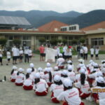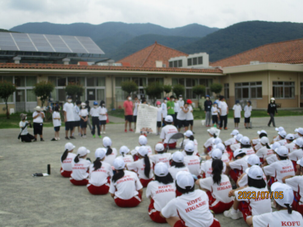 7月5日(水)、甲府市立東中学校との学校間交流が行われました。真夏日が続き、天候や気温が心配されましたが、交流当日は曇り空となり、校庭での活動も問題なく行うことができました。お互いにはじめは緊張した表情でしたが、会が進むにつれ、リラックスした様子や笑顔が見られました。